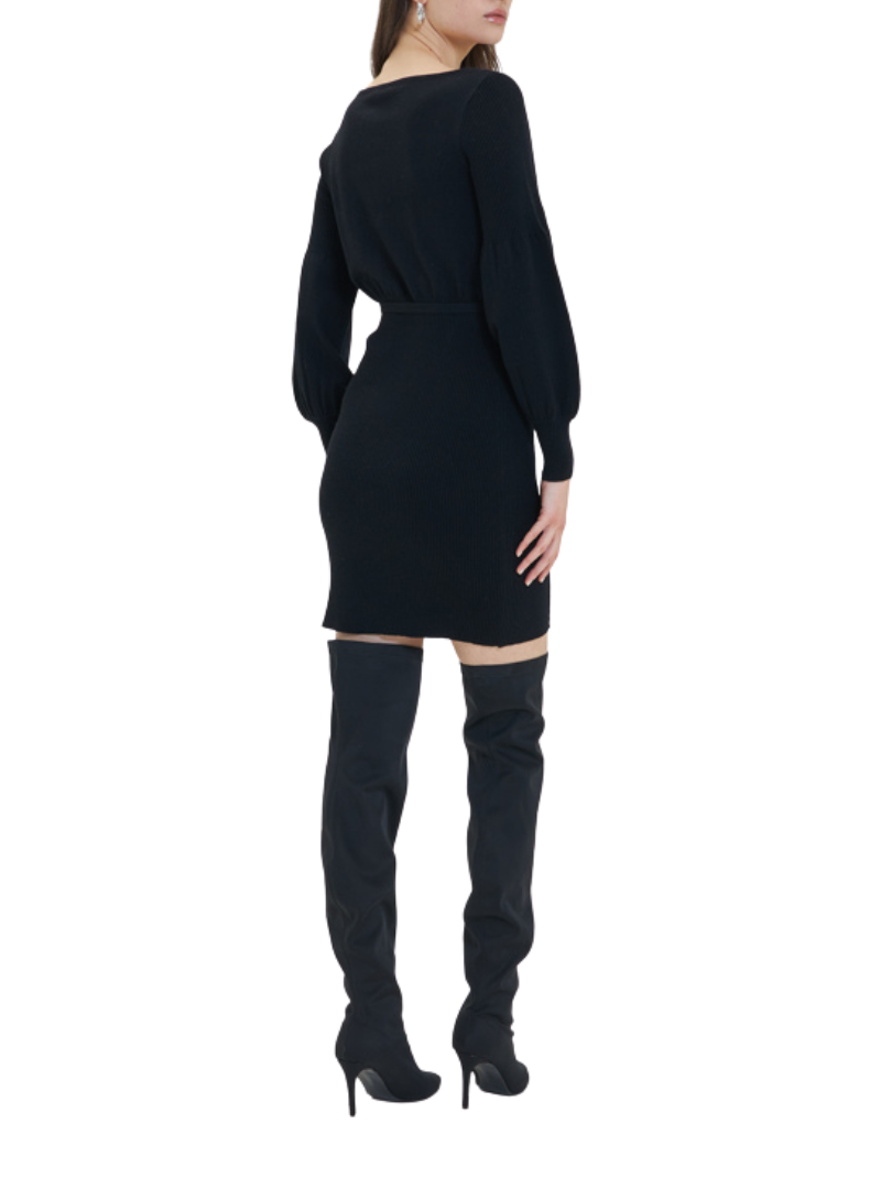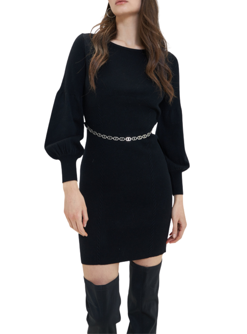 Materiale: Abito in maglia aderente Tessuto a costine elasticizzatoScollo rotondo Maniche lunghe a sbuffo con polsini aderentiSilhouette aderente Cintura decorativa in metallo per definire il punto vitaLunghezza mini