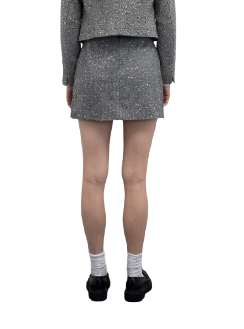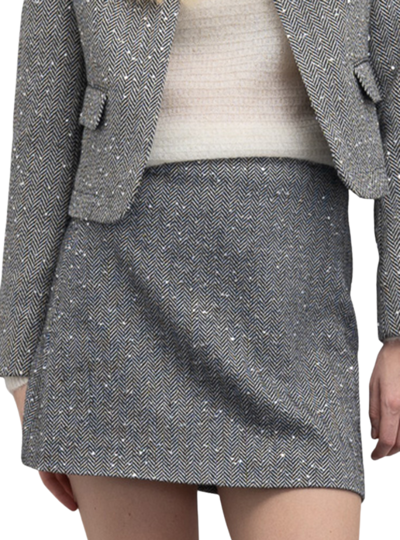 Materiale: Minigonna a taglio drittoTessuto chevronné con applicazioni di paillettes.Chiusura laterale nascosta
