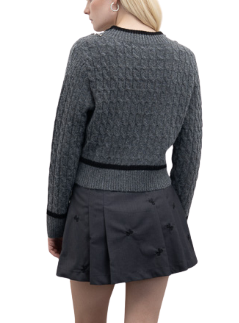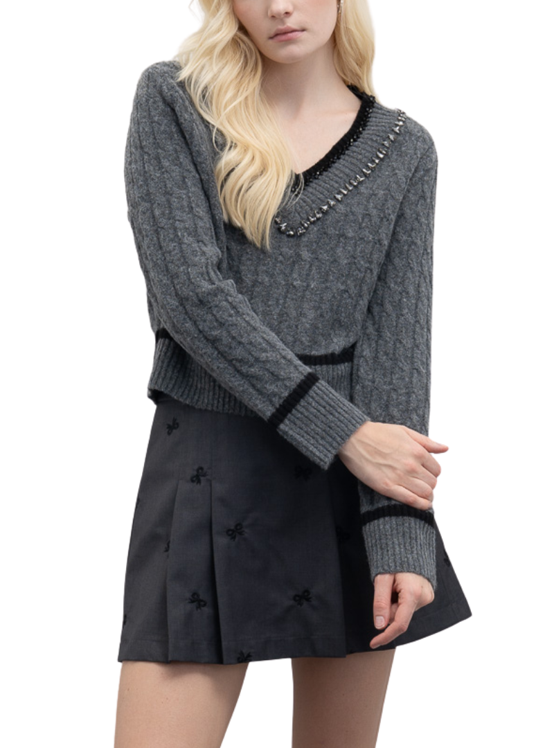 Materiale: Maglione intrecciato Scollo a V decorato con dettagli di pietre e bordo a contrasto.Maniche lungheVestibilità comoda e finitura a coste su polsini e orlo.Taglio dritto.33% ACRYLIC 63% POLYESTER 4%SPANDEX