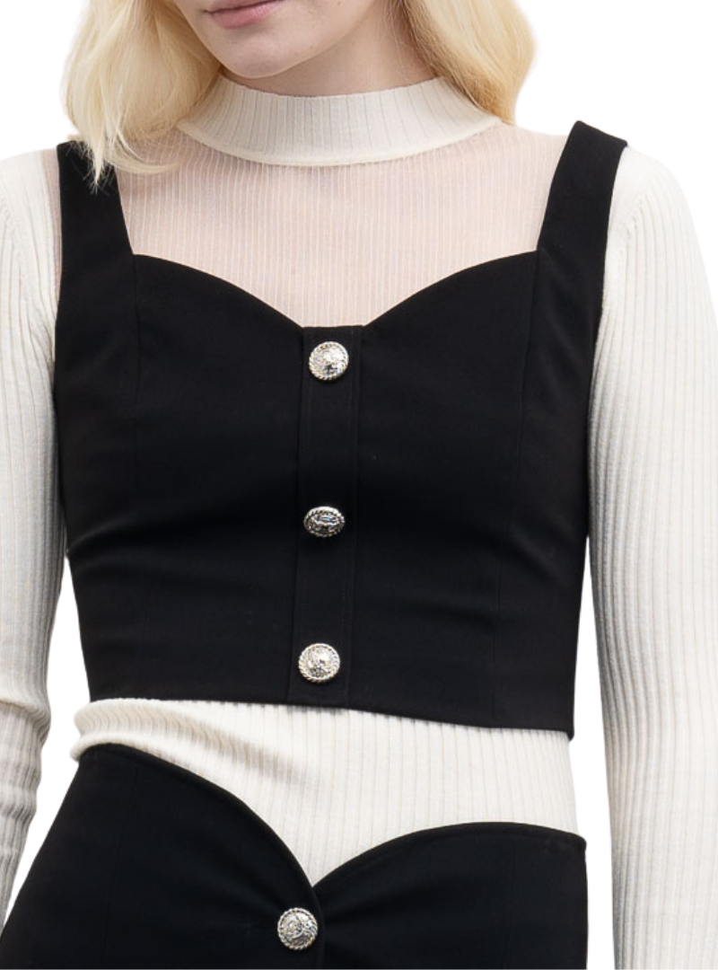 Materiale: Gilet in crêpeScollo a cuoreDesign strutturato con taglio aderente.Chiusura frontale con bottoni decorativi.