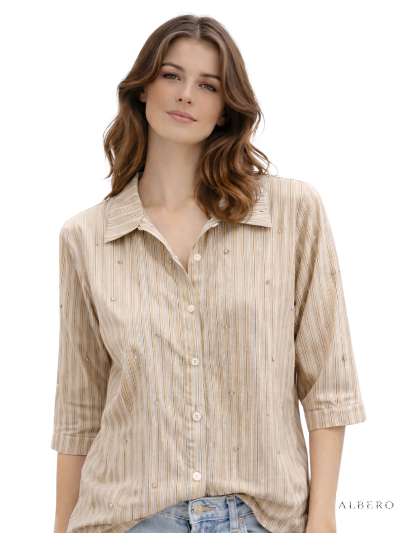 Materiale: Camicia modello morbidoFantasia a righe verticaliChiusura con bottoniColletto classicoManica 3/4Dettaglio strass applicati