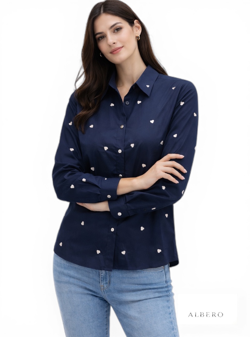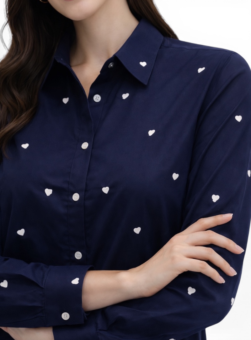 Materiale: Camicia modello avvitatoChiusura con bottoniColletto classicoDettaglio cuori ricamati a contrasto