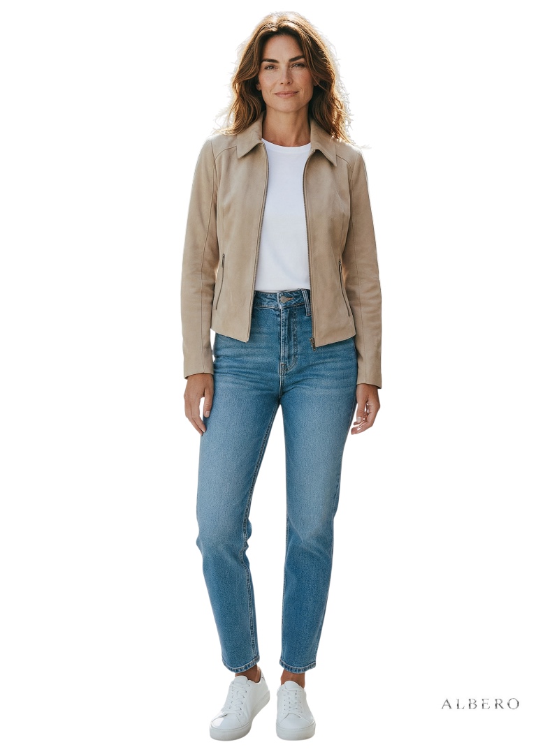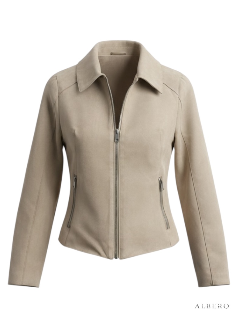 Materiale: Giubbino effetto scamosciatoModello avvitatoLunghezza sui fianchiChiusura con zipTasche con zip laterali