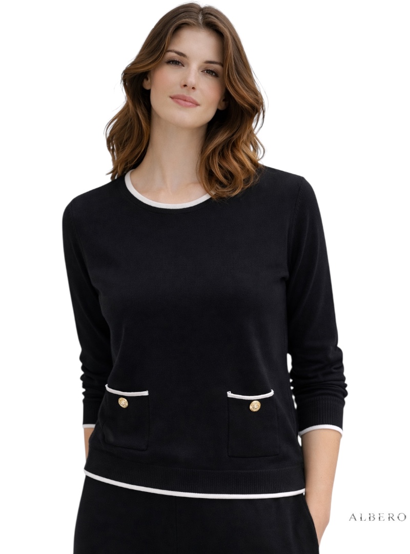 Materiale: Pullover in Maglia GirocolloBordi a contrastoDettaglio con bottoni