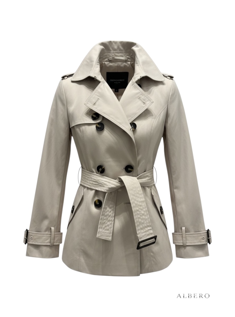 Materiale: Trench in cotoneModello doppiopettoLunghezza altezza bacino Chiusura con bottoni e cinturaReversTasche laterali con bottone