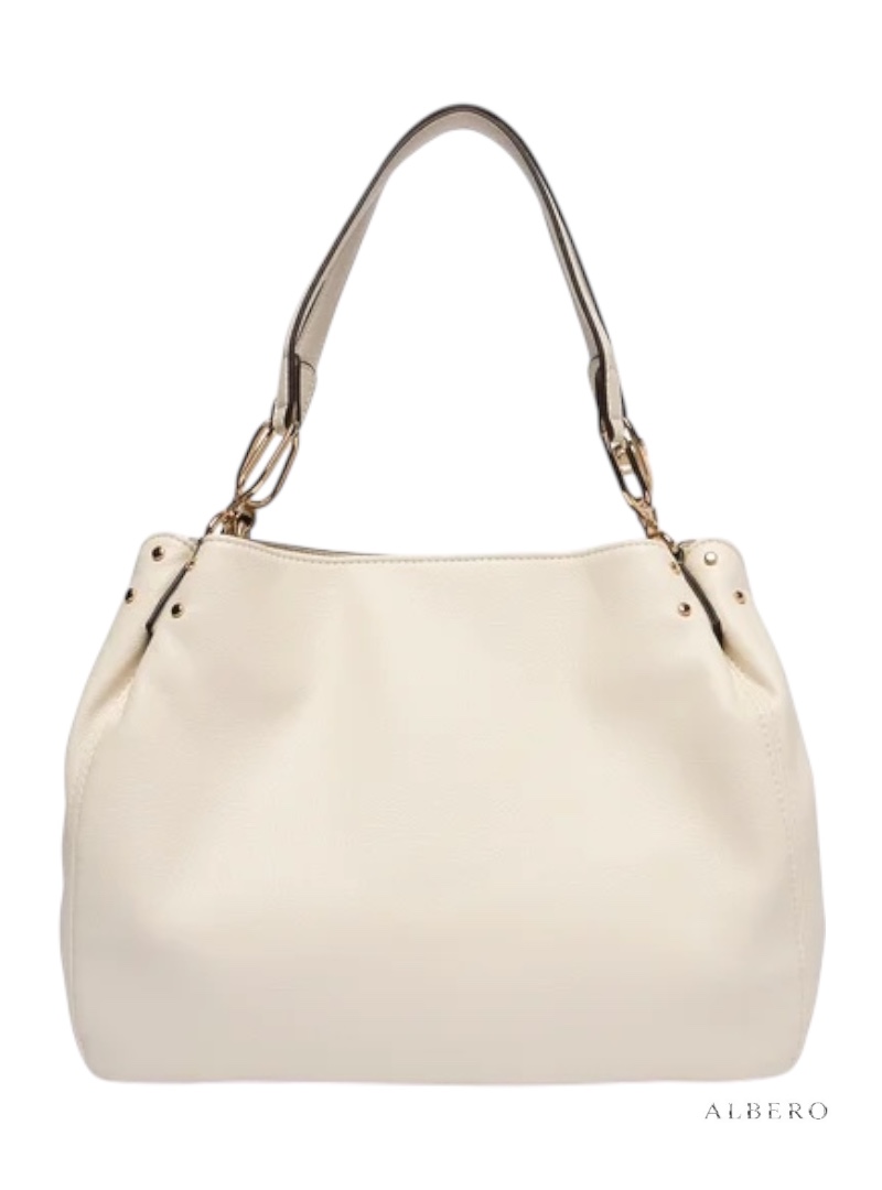 Materiale: Borsa spallaEffetto bottalatoCharm in tintaManici con dettagli in metalloLogo lettering