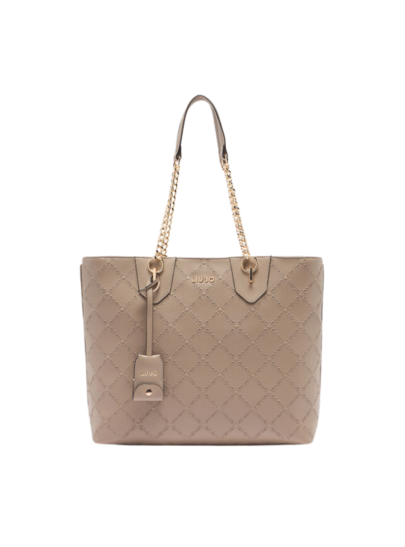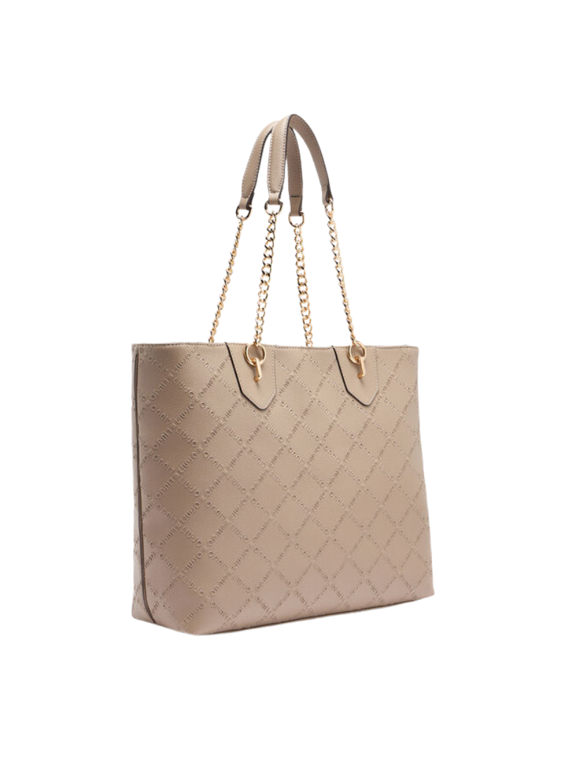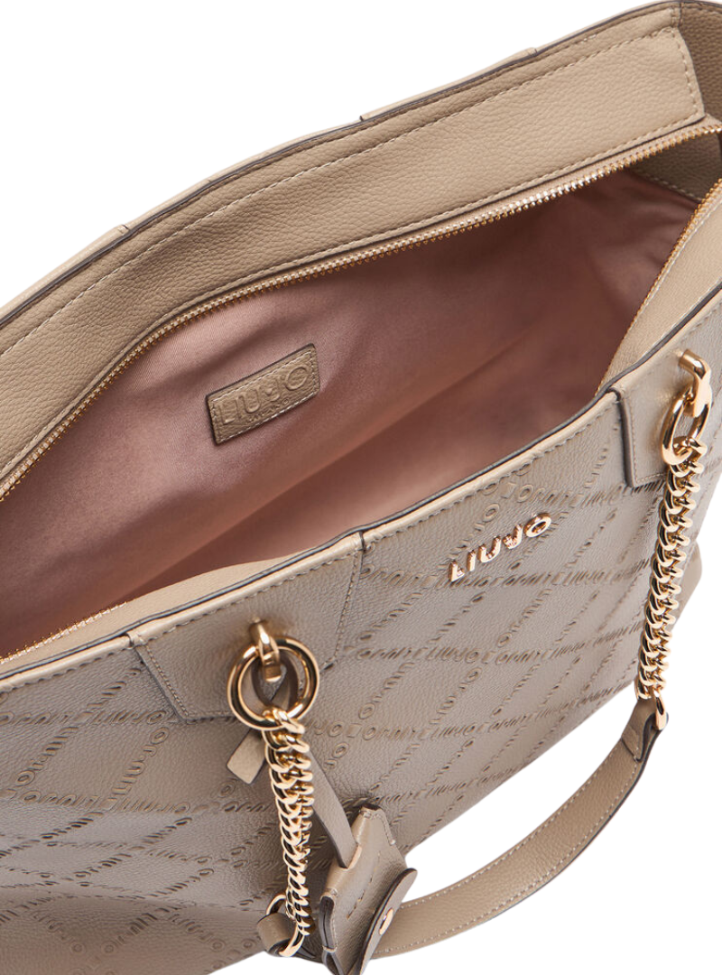 Materiale: Shopping bag con stampa effetto bottalatoLogo in metalloLogo a rilievo all overComodi manici con catenaCharm logatoEtichetta interna logataFodera internaChiusura con zipMisure: 38 x 14 x 27 cm