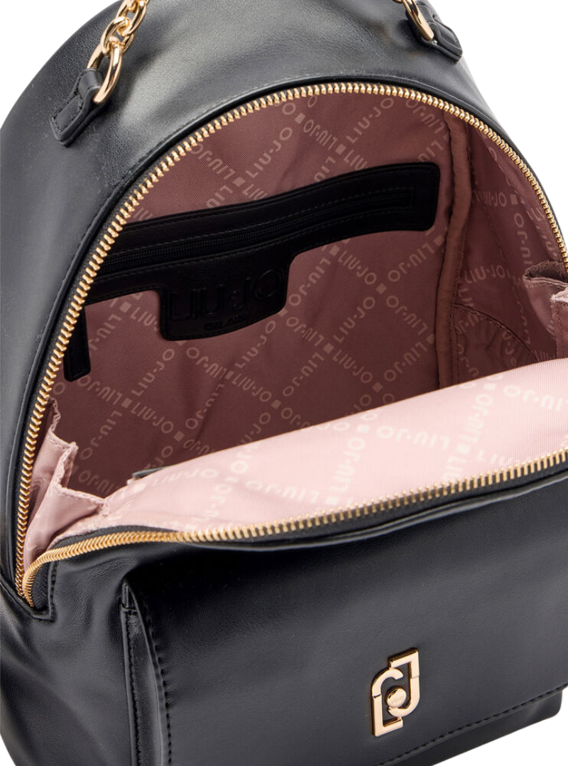 Materiale: Zaino medioLogo LJ in metalloTasca frontale con pattaDettaglio catenaSpallacci regolabiliPochette rimovibileTasca internaFodera interna logataChiusura con zipMisure: 24 x 12 x 31 cm