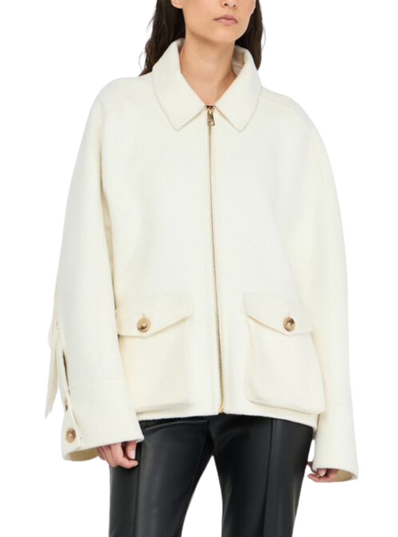 Materiale: Caban in panno di misto lanaFrange sul retroCollo a camiciaPolsi con bottoniTasche con patta e bottoneChiusura con zipFodera internaTessuto principale: 50% Poliestere, 50% Lana