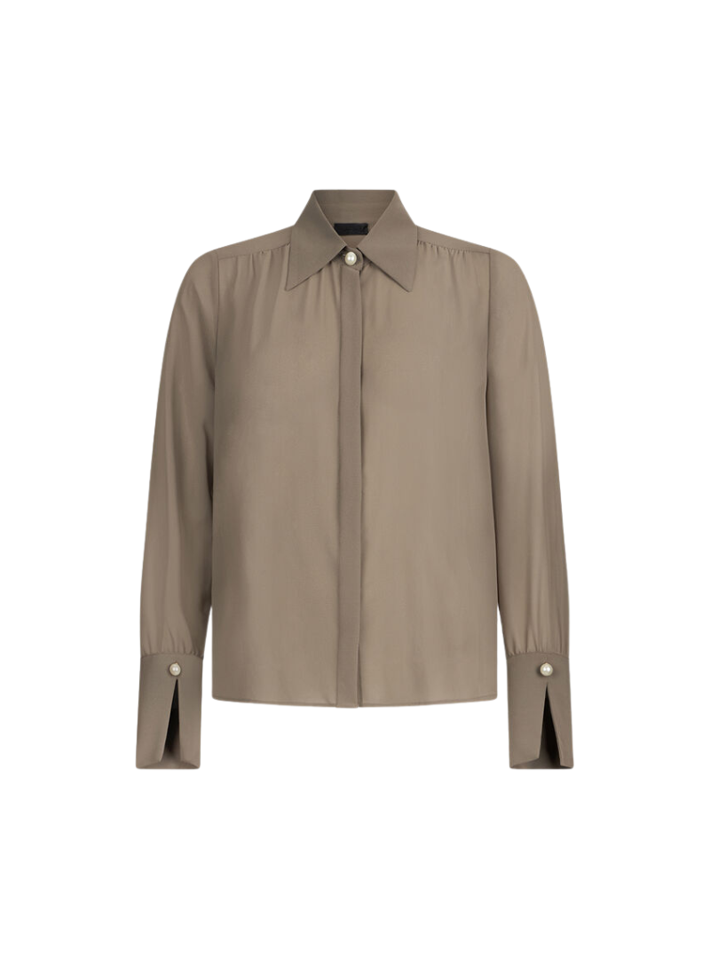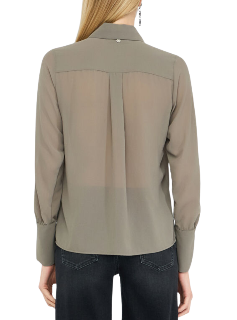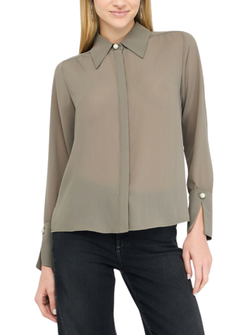 Materiale: Camicia in georgette Colletto alla francese con perlaManiche lunghePolsi con spacchetto e perlaLogo in metallo sul retroChiusura coperta con bottoni
