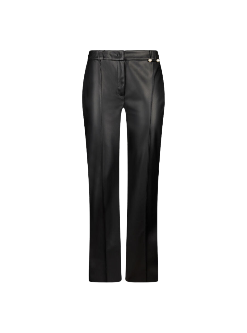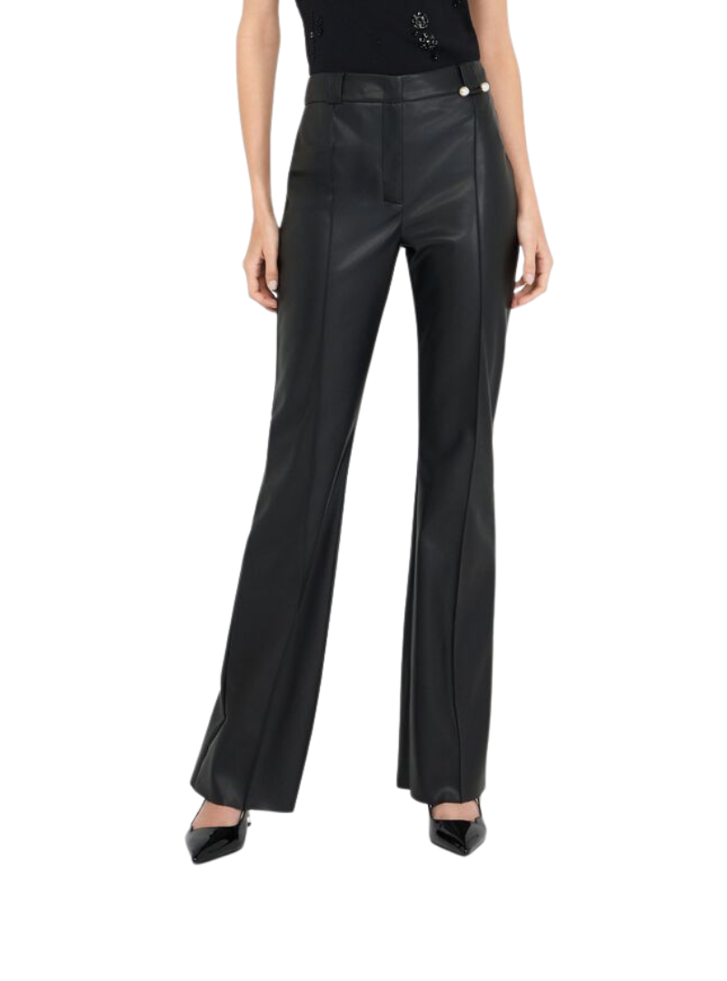 Materiale: Pantaloni in tessuto effetto spalmatoGamba flarePiega cucitaPerle in vitaTasche a filetto sul retroLogo in metallo sul retroFodera internaChiusura con zip nascosta