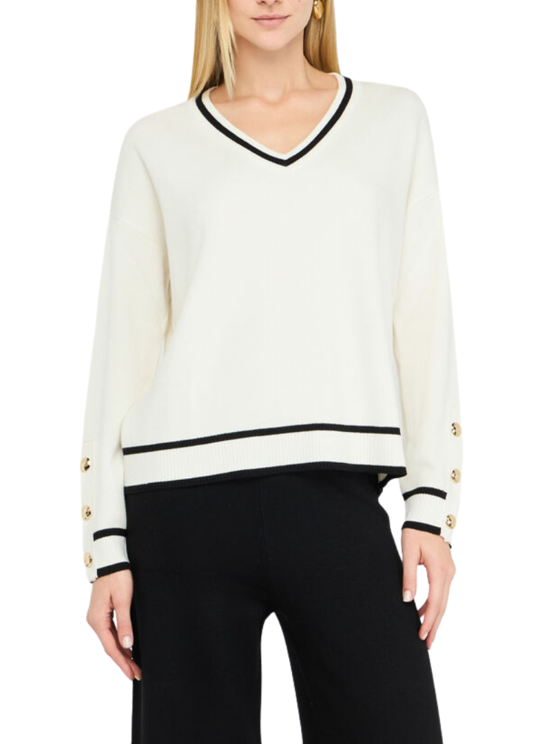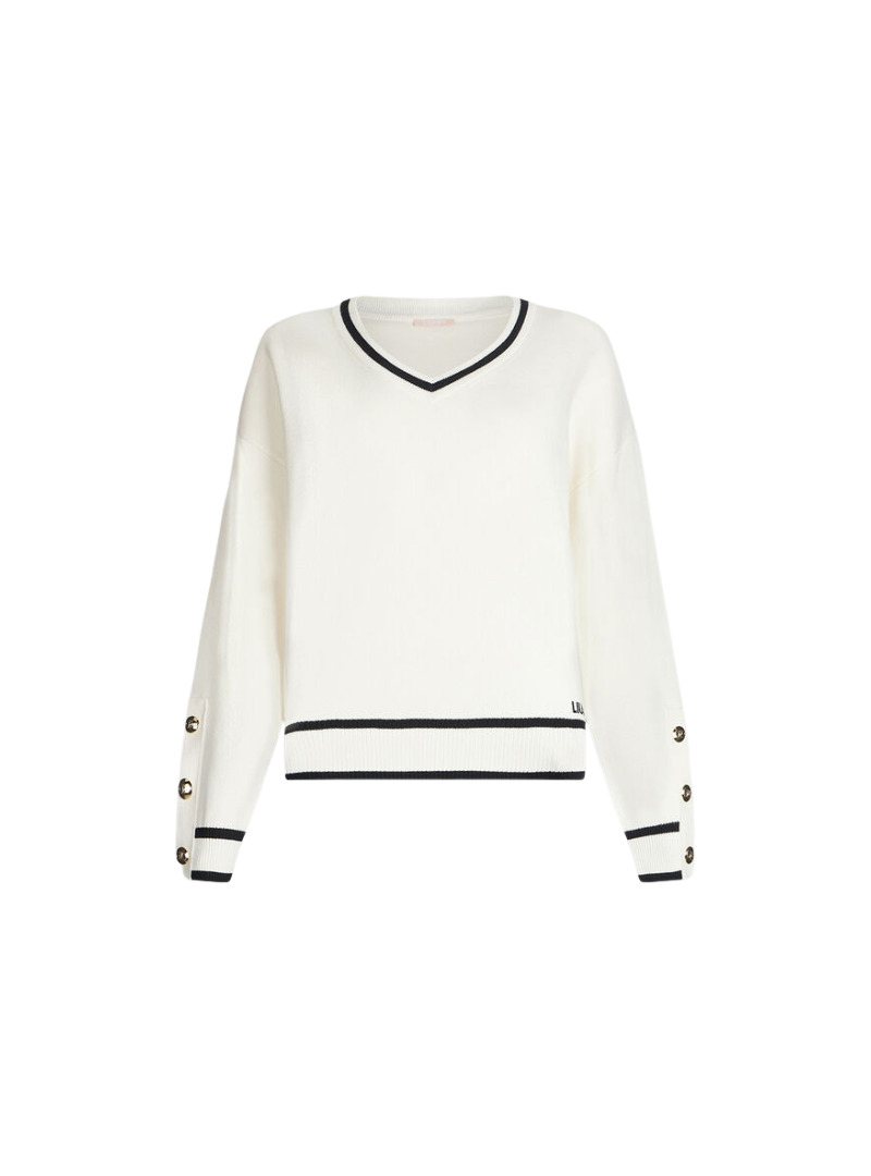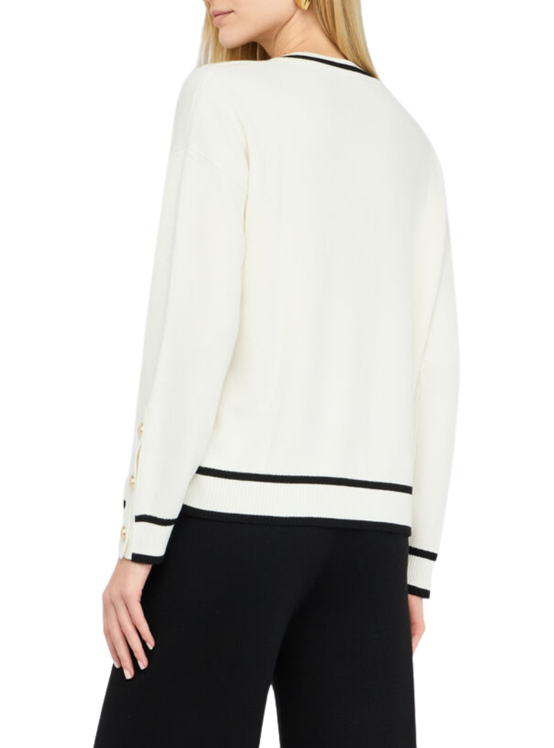 Materiale: Maglia in misto setaMotivo a righe a contrastoBottoni decorativi doratiScollo a VManiche lungheLogo jacquardBordi a costineTessuto principale: 60% Viscosa, 30% Poliammide, 10% Seta