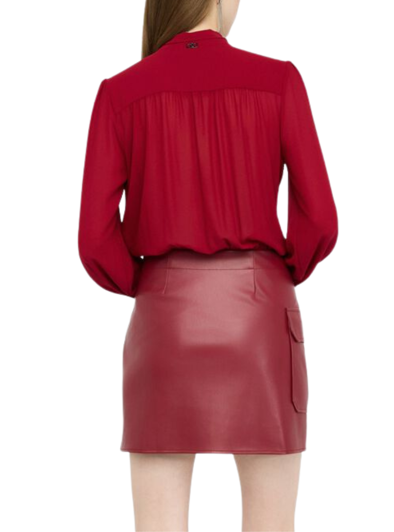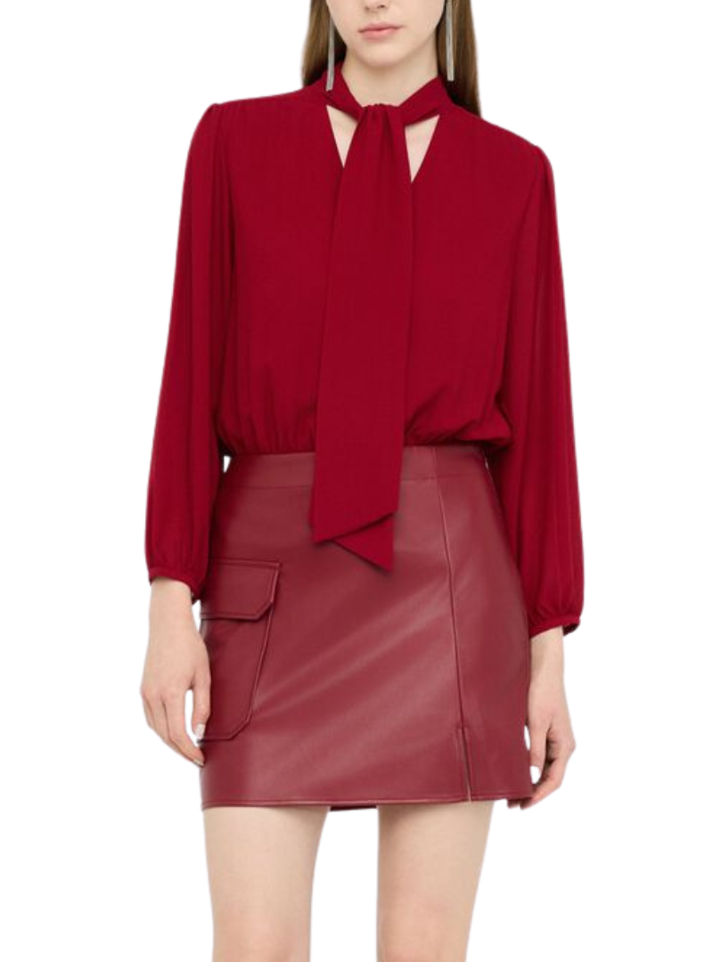Materiale: Abito corto con top in crêpeScollo a VFiocco-foulardManiche lungheGonna in tessuto spalmatoTasca con pattaChiusura con zipTessuto principale: 100% Poliestere