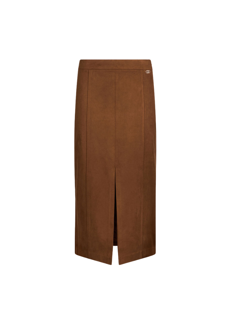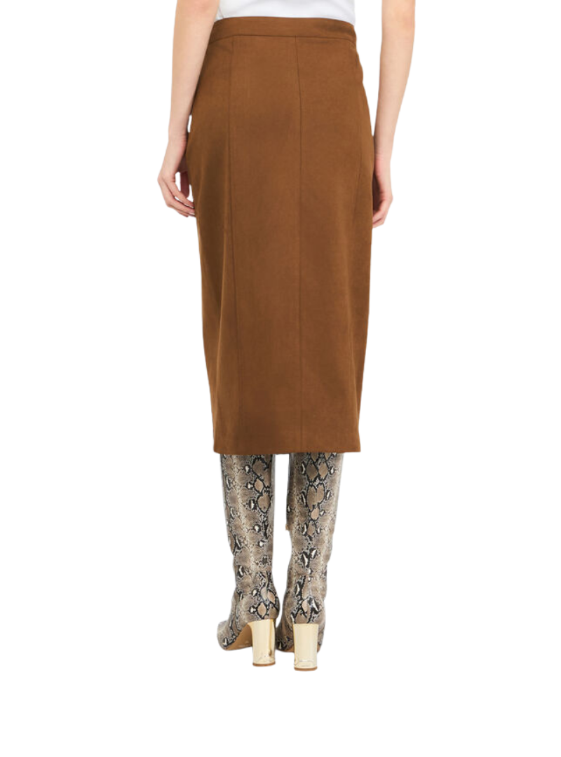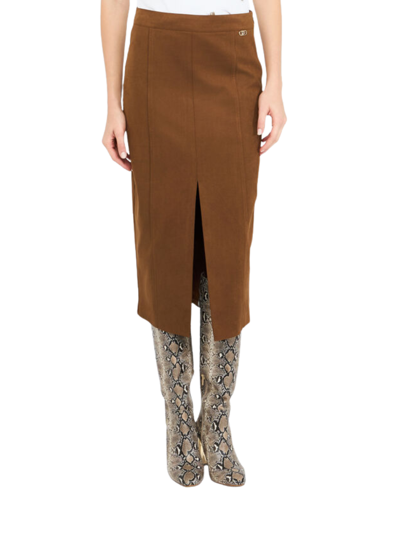 Materiale: Gonna midi effetto camoscioSpacchetto sul davantiLogo monogram in metalloChiusura con zip invisibile sul latoTessuto principale: 95% Poliestere, 5% Elastan