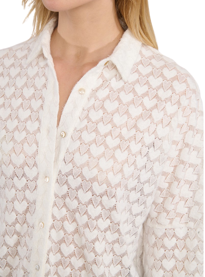 Materiale: Camicia traforata con fantasia a cuore In semitrasparente Maniche lunghe Polsini a punto smock stretti Colletto blusa Chiusura con bottoni perlati a tutta lunghezza sul davanti90% poliestere, 10% elastan
