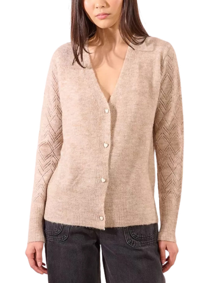 Materiale: Cardigan in maglia fineManiche lunghe traforatePolsini strettiAmpio scollo a VChiusura con bottoni fantasia al centro sul davantiVestibilità slim54% Poliestere, 38% Acrilico, 5% Lana, 3% Elastan