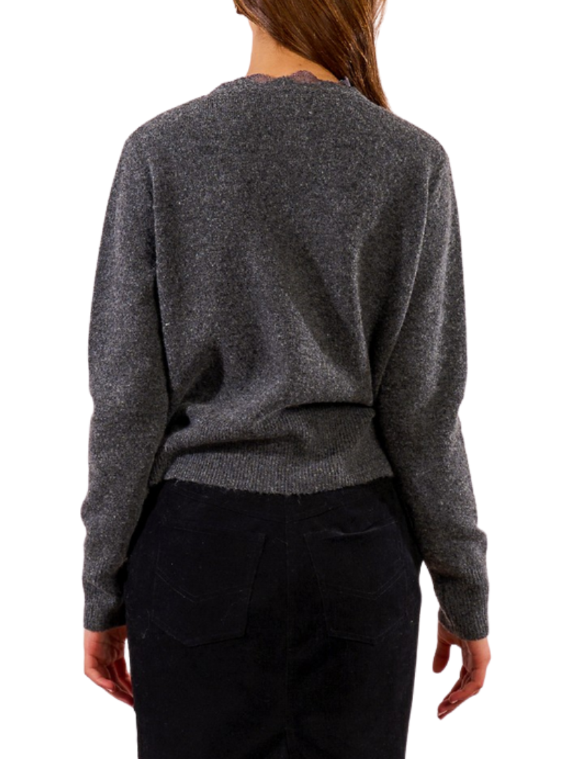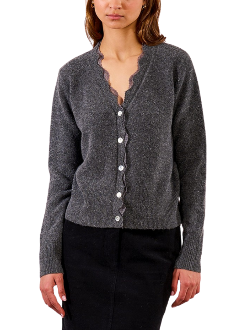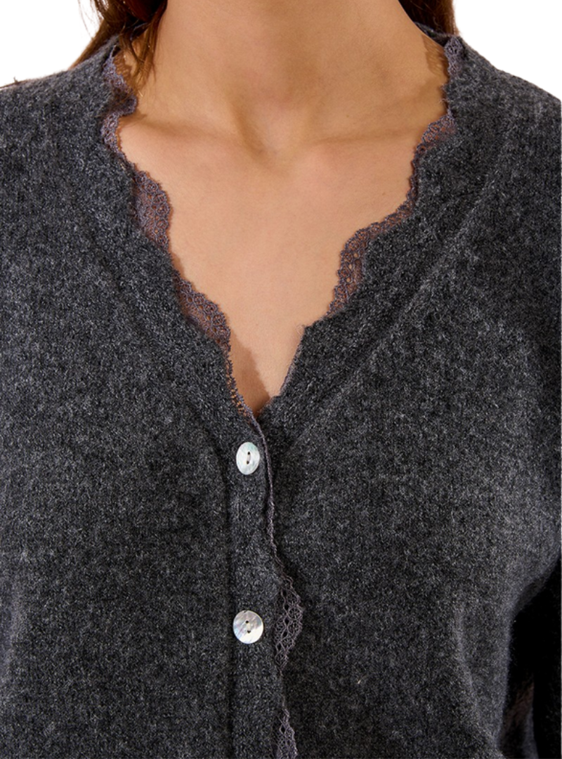 Materiale: Cardigan in magliaScollo a V con dettagli in pizzoAbbottonatura con bottoni in pizzoBottoni perlescentiBordi smerlatiMorbido al tatto65% poliestere riciclato, 13% poliammide, 13% acrilico, 6% lana, 3% elastan