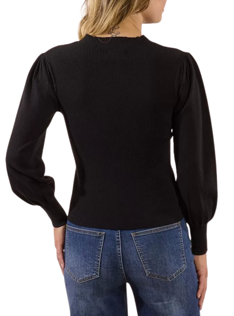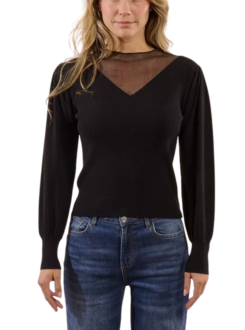Materiale: Pullover a maglia sottileManiche lunghe a sbuffoPolsini larghi e strettiScollo a VCollo semi-alto in semitrasparenzaTaglio corto e aderente51% Viscosa, 30% Poliestere, 19% Poliammide