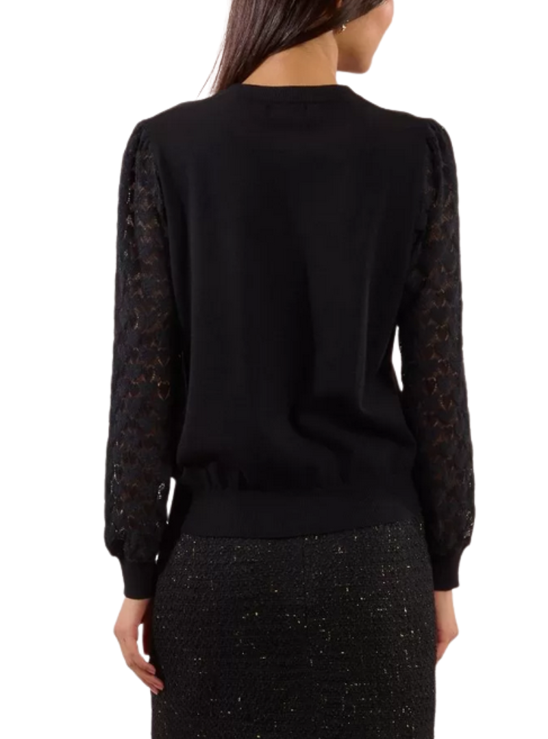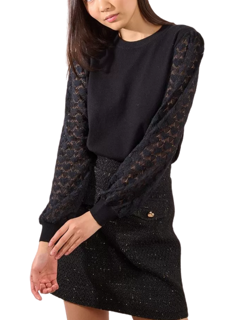 Materiale: Pullover lavorato a magliaManiche lunghe traforate, fantasia a cuore Polsini strettiScollo rotondo vicino al colloTaglio dritto51% Viscosa, 30% Poliestere, 19% Poliammide