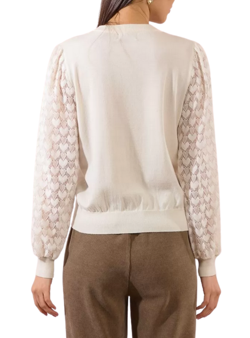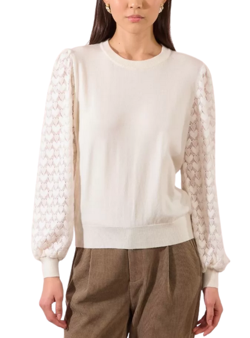 Materiale: Pullover lavorato a magliaManiche lunghe traforate, fantasia a cuore Polsini strettiScollo rotondo vicino al colloTaglio dritto51% Viscosa, 30% Poliestere, 19% Poliammide