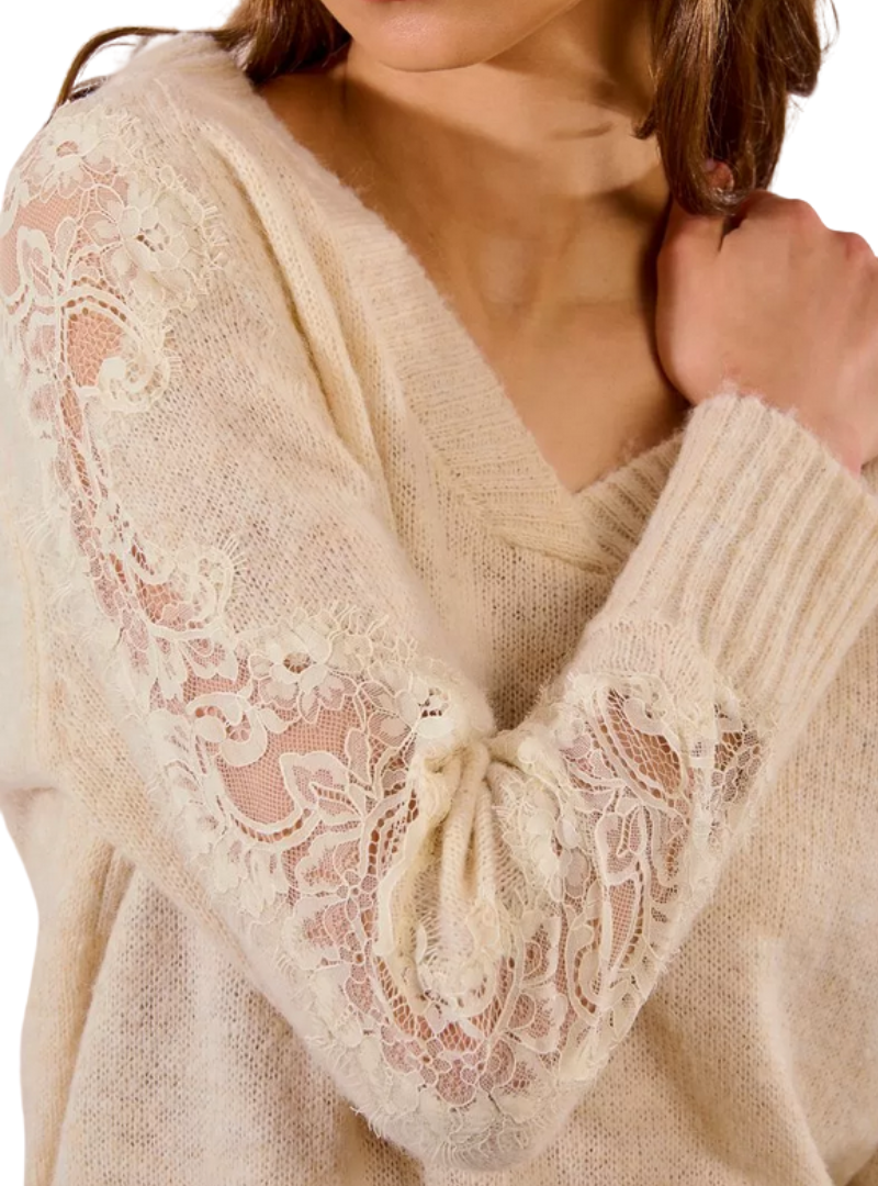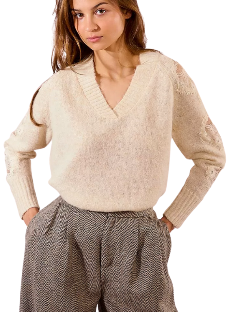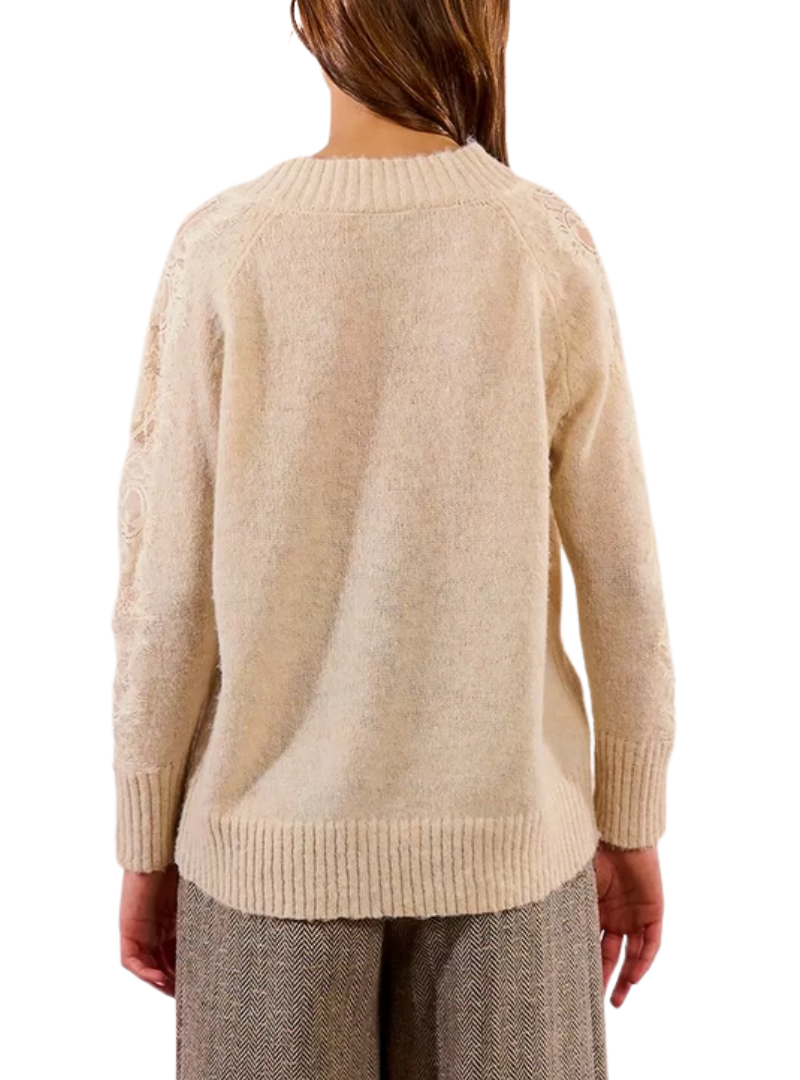 Materiale: Pullover in magliaManiche lunghe traforate con inserto in pizzoAmpio scollo a VTaglio drittoFinitura a costine60% Poliestere Riciclato, 30% Poliammide, 10% Lana