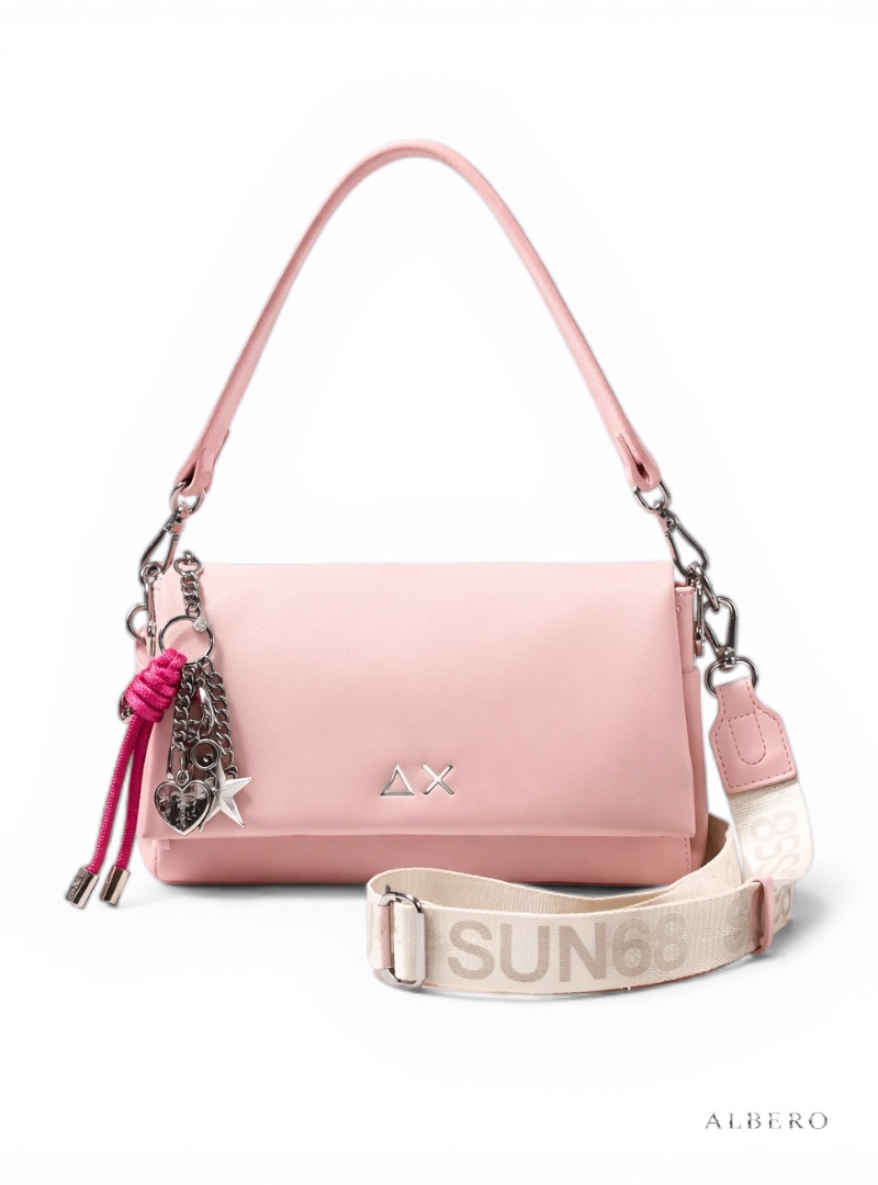 Materiale: Borsa a spallaManico fissoTracolla removibileChiusura con pattaLogo impresso a contrastoCharm colorato